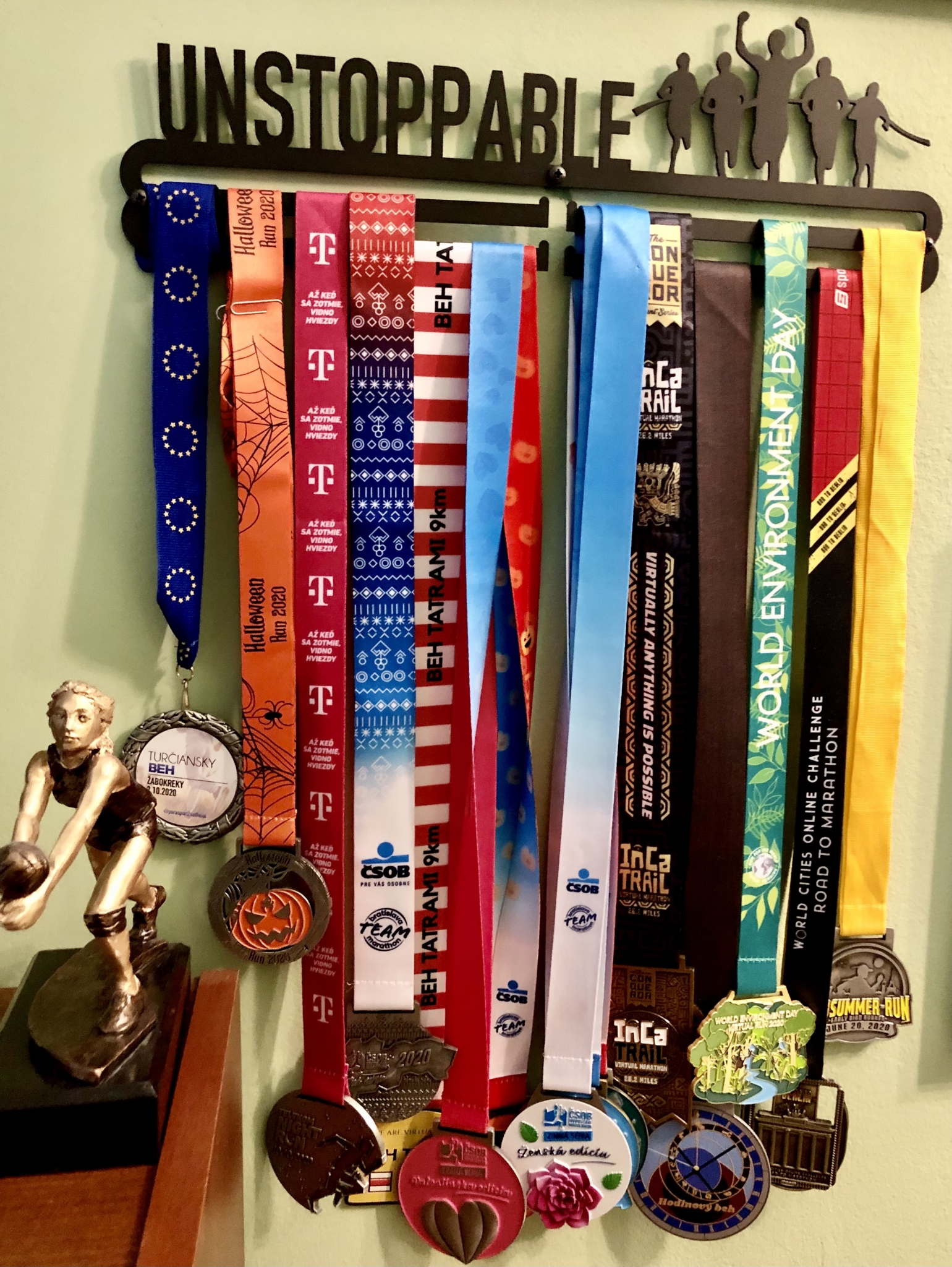 Po osprchovaní sadám za notebook a začínam písať o podstate mojej bežeckej motivácie. Uplynul už viac než rok odkedy som začal pravidelne behávať v prírode. Prvotnou motiváciou k tomu, aby som vstal od písania učebníc a vedeckých článkov a začal sa konečne hýbať, bola knižka od Andersa Hansena Dobehni svoj mozog. No pre udržanie motivácie mi to po čase prestalo stačiť. Od prírody som súťaživý typ a rád prijímam výzvy a zbieram ocenenia. Počas pôsobenia v akademických funkciách som ocenenia študentom a kolegom skôr rozdával, než prijímal a tak som si povedal, že by nebolo zlé prijať nejakú výzvu, zapojiť sa do bežeckej súťaže a získať nejaké ďalšie ocenenie. No počas pandémie boli športové súťaže pozastavené a tak som si myslel, že budem pomaly trénovať a neskôr, po pandémii, sa postavím na štart nejakého behu a získam aspoň medailu za účasť. No len čo som si to pomyslel, tak sa stalo niečo, čo určite poznáte z vlastnej skúsenosti. Hneď ako vyslovíte túžbu niečo vlastniť, Mark Zuckerberg vám objekt vašej túžby prinesie ako na zaltom podnose. A stalo sa to aj mne. Na Facebooku a Instagrame mi začali do feedu prichádzať reklamy na virtuálne preteky po celom svete. Stačilo sa len prihlásiť, zaplatiť štartovné, odbehnúť vybranú trať, beh potvrdiť GPS záznamom z hodiniek alebo mobilu a krásna medaila bola o pár dní vaša. Priznávam sa, že ma to pohltilo. Medaile boli nádherné, čo to som mal už natrénované a tak som do toho išiel. Vyhľadával som vhodné medailové výzvy a prispôsoboval som im svoje tréningy.