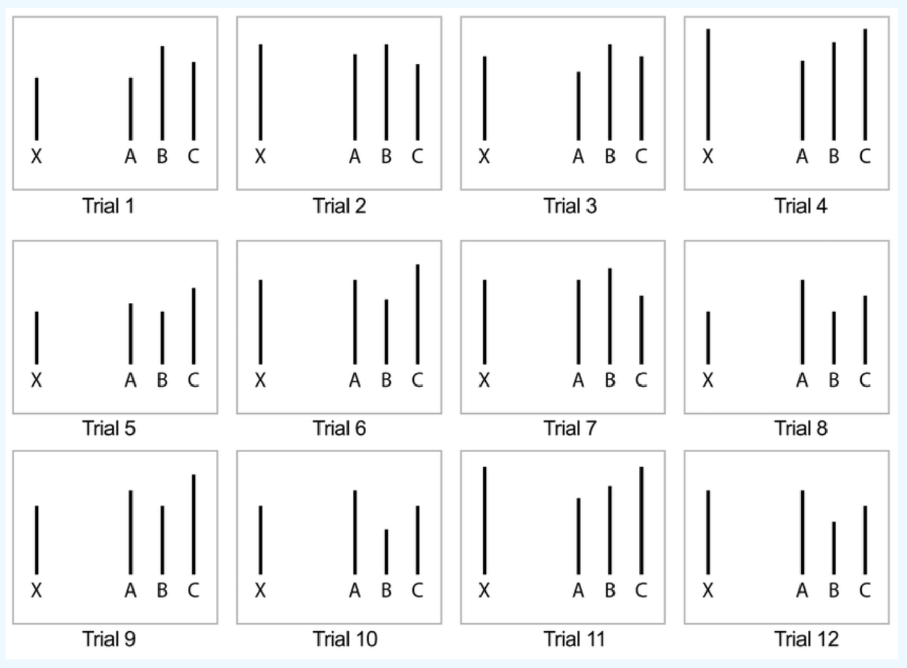 Skupina siedmich až deviatich účastníkov bola usadená do miestnosti a predložená im bola vizuálna úloha: porovnať dĺžku troch čiar (A, B, C) s referenčnou čiarou X. Úloha bola jednoduchá a odpoveď zjavná.